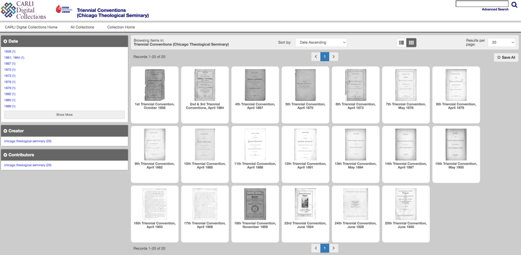 I worked on preparing, migrating digital archival collections from Omeka to CONTENTdm. The main objective of the was to help CTS’s collections to be more accessible and useable for the correct audience. That also meant that it could be sourced in arrigrating platforms for discoverability such as, The American Theological Library Association (Atla) Digital Library, a shared repository. Checking best practices for each platform and correcting metadata will eventually provide another access point for CTS’s collections, which is crucial for discovery and use.